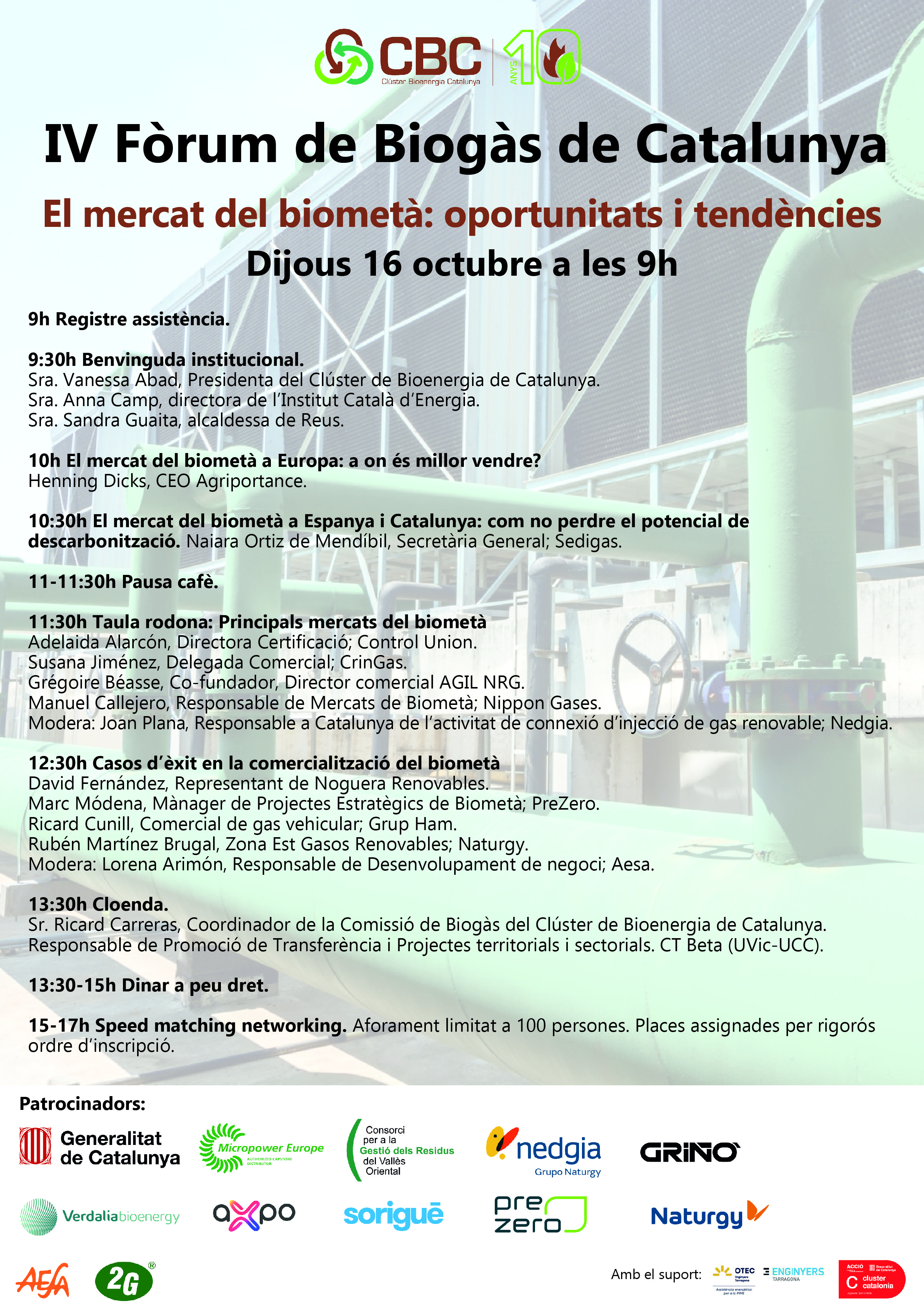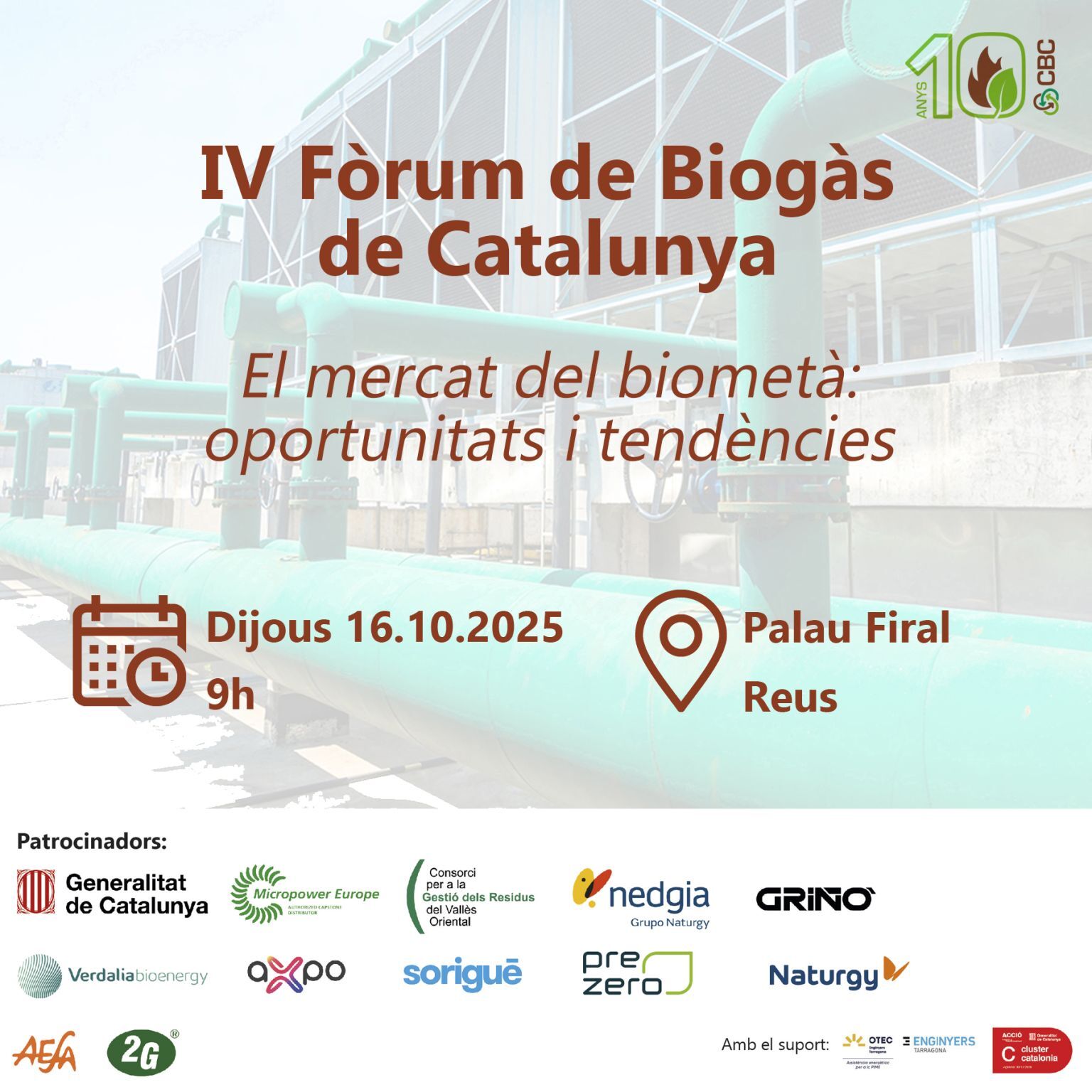Quarta edició del Fòrum de Biogàs de Catalunya. Enguany la temàtica del Fòrum és "El mercat del biometà: oportunitats i tendències".